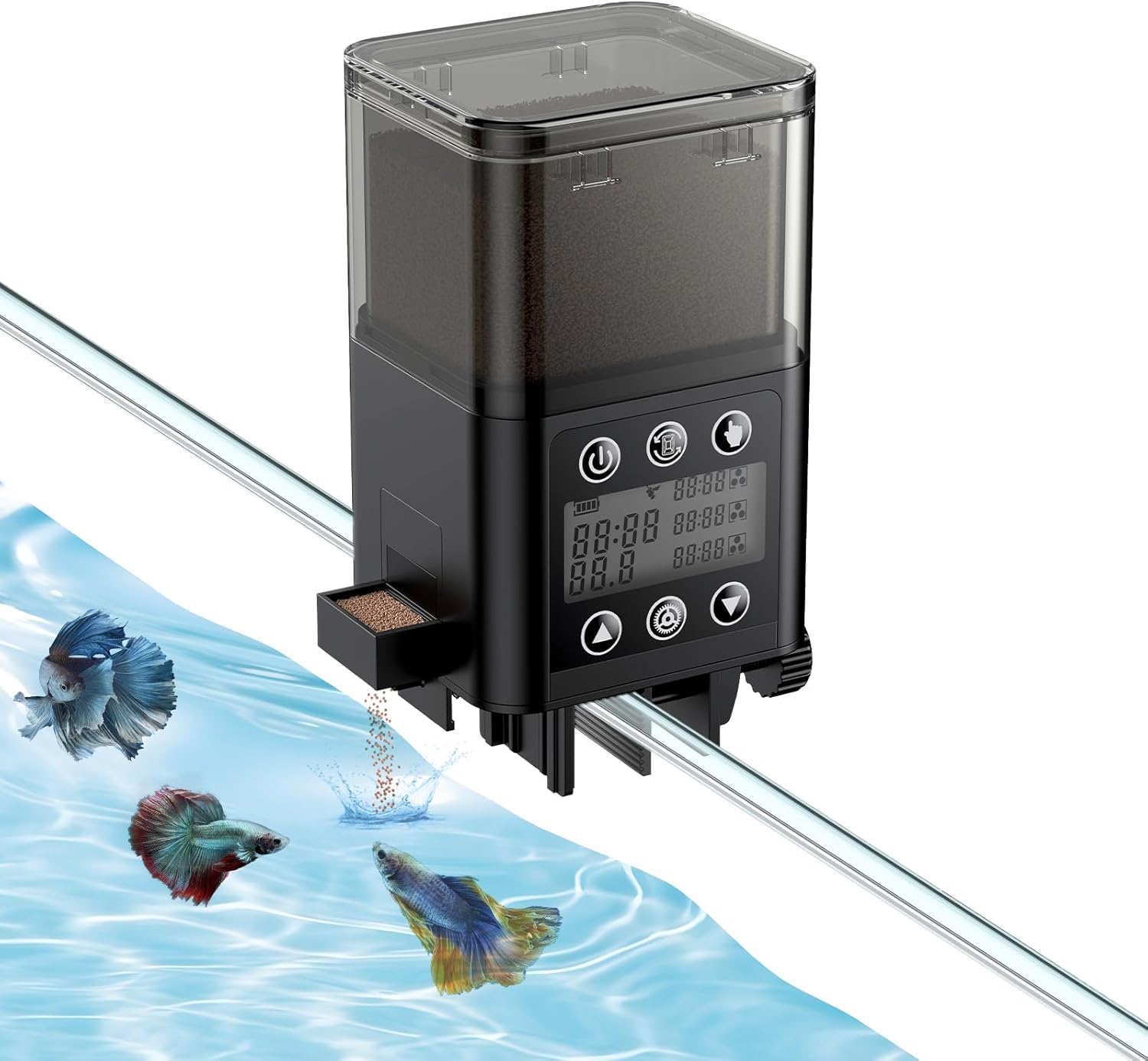 - Efficient & Handy: Driven by 2 AAA batteries, the aquarium fish feeder can last 1 to 3 months. 2 selectable installation methods – simply mount it on the tank wall with the fixation clamp, or attach it to the tank lid with the U-shaped base and sticker