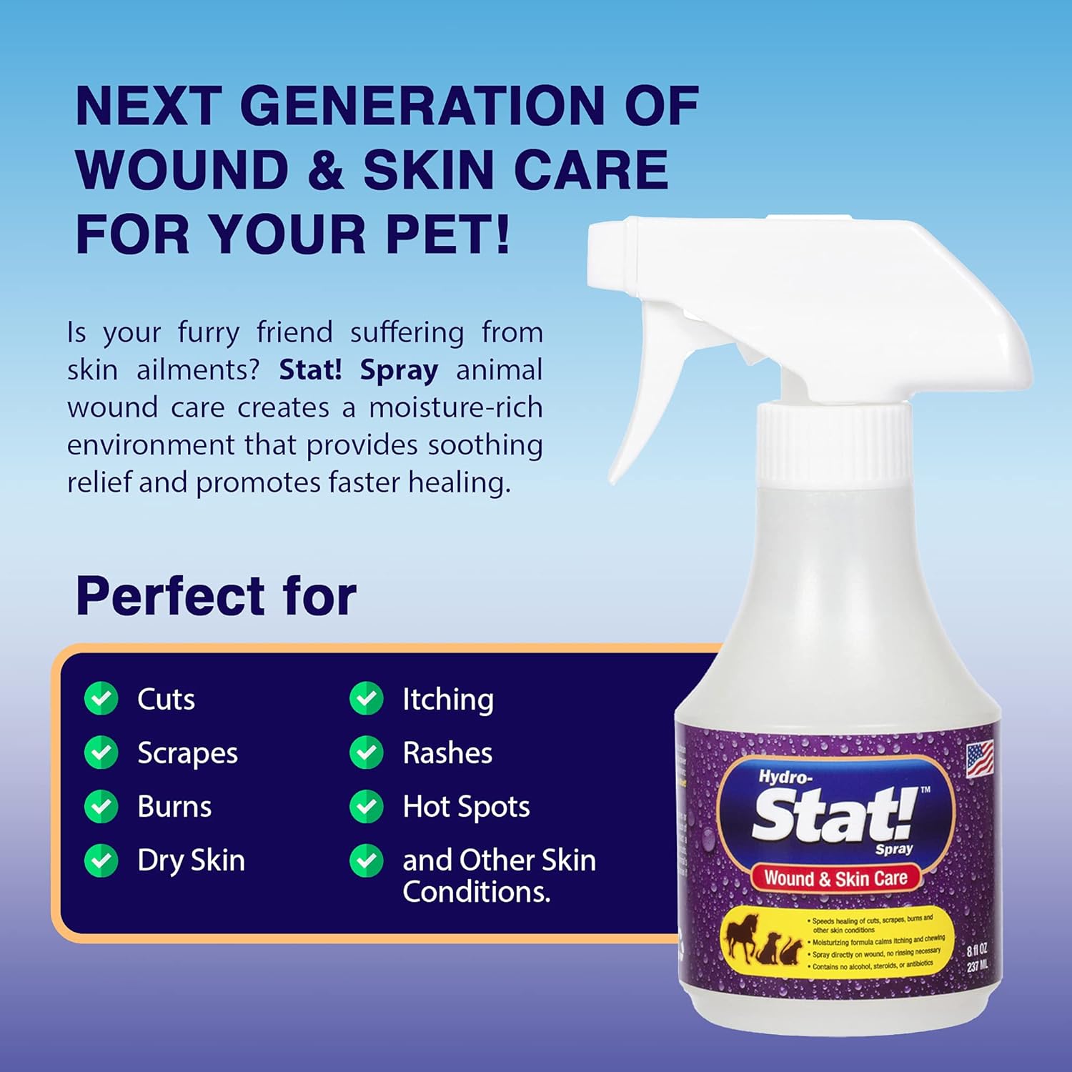 - HEAL WOUNDS FASTER: Don’t let your pet suffer; our first aid spray for animals soothes the skin and creates a moisture-rich environment which reduces irritation and promotes faster healing. Hydro-Stat! wound care is an itchy skin soother for dogs, cats, and horses that treats burns, scratches, rashes, hot spots, and other skin conditions.