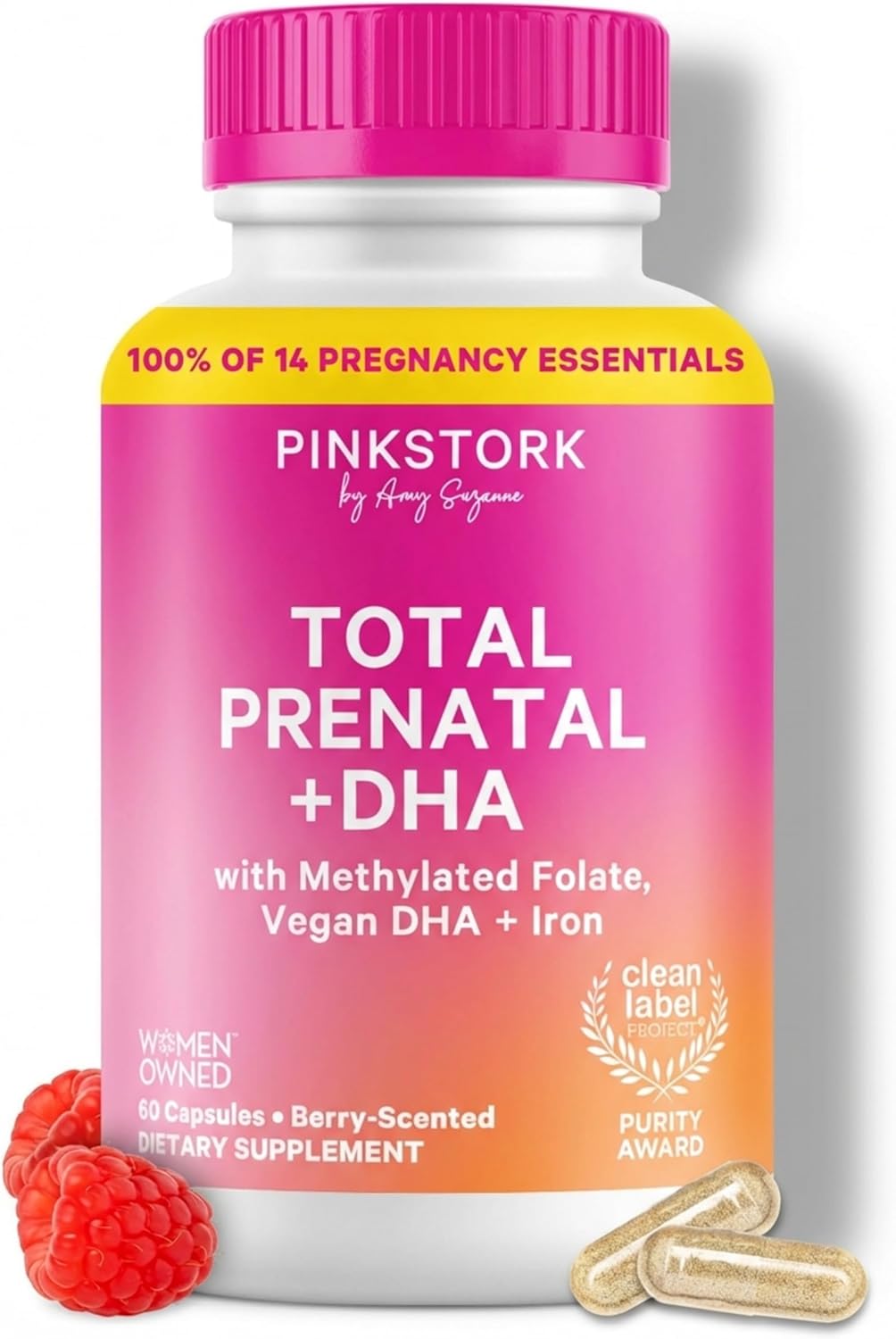 Pink Stork Total Prenatal Vitamins | DHA, Folate, Iron, Choline, Vitamin B12 | Prenatals for Women to Support Fetal Development | Pregnancy Essentials | Clean Label Award Winner | 60 Capsules, Berry