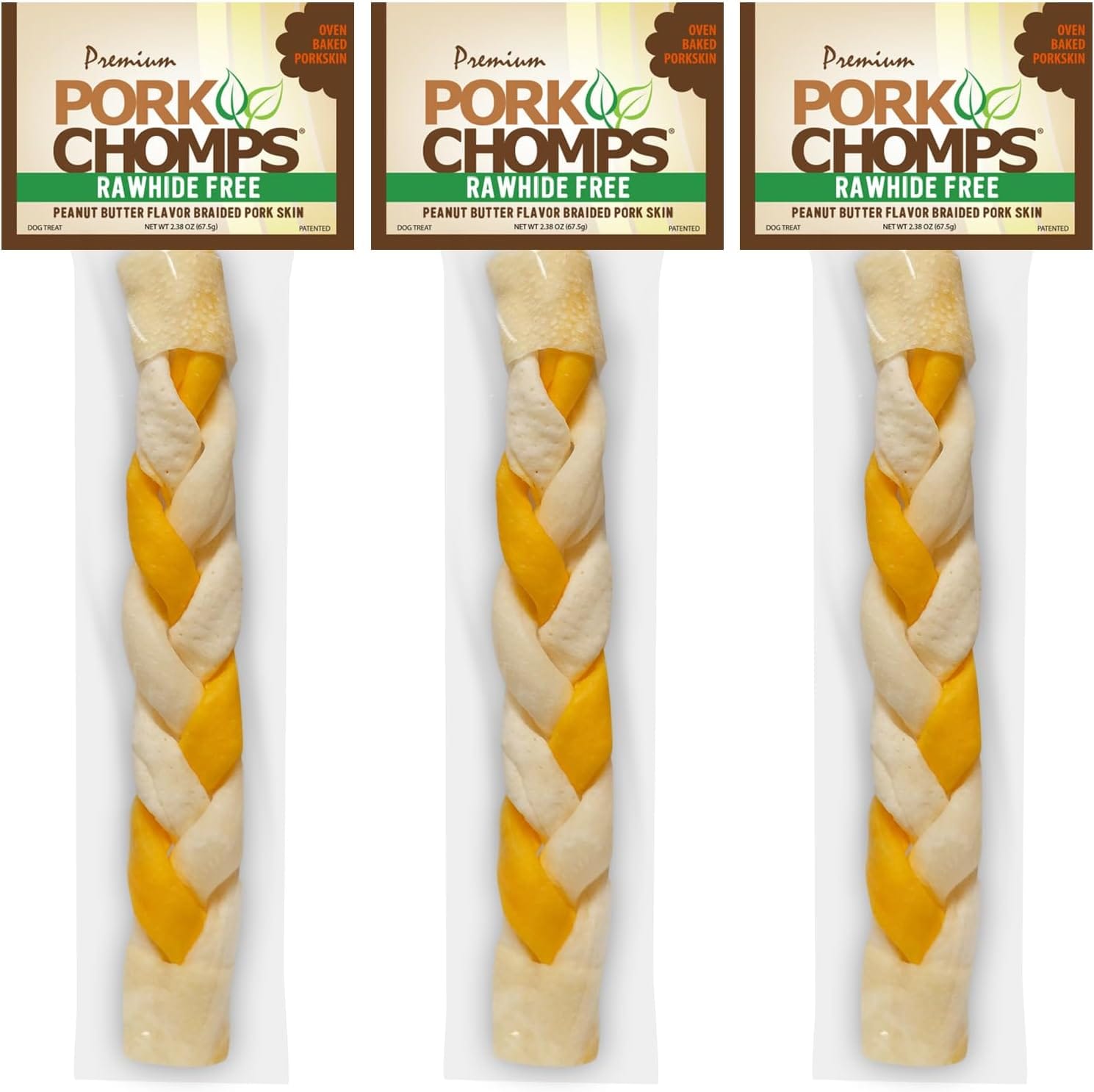 Pork Chomps Roasted Pork Skin Dog Chew, 8-inch Braid, Peanut Butter Flavor, 1 Count (Pack of 3)