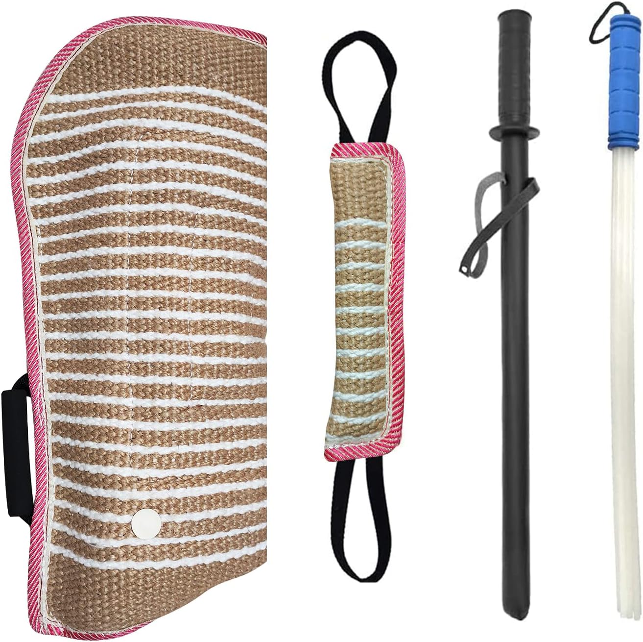 - 【Package Components】 1 x Dog bite sleeve; 1 x Dog bite pillow tug toy; 1 x Black Dog training stick; 1 x White Dog training stick.