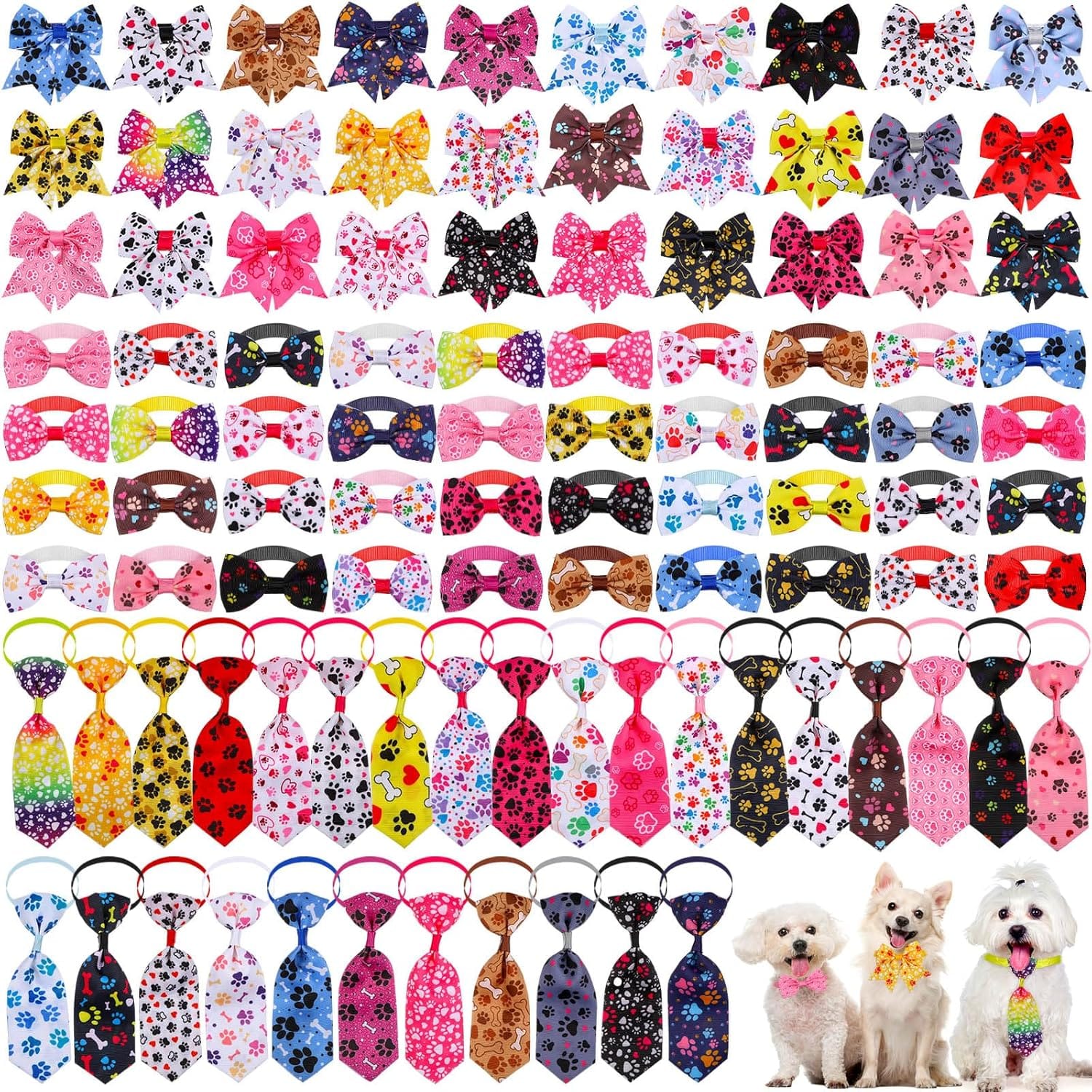 Reginary 100 Pieces Dog Bow Tie Collar Set Include 40 Dog Neckties, and 30 Puppy Bowties, 30 Collar Flowers, Adjustable Pet Ties Grooming for Small Medium Cats Pets Supply(Paw Bone)