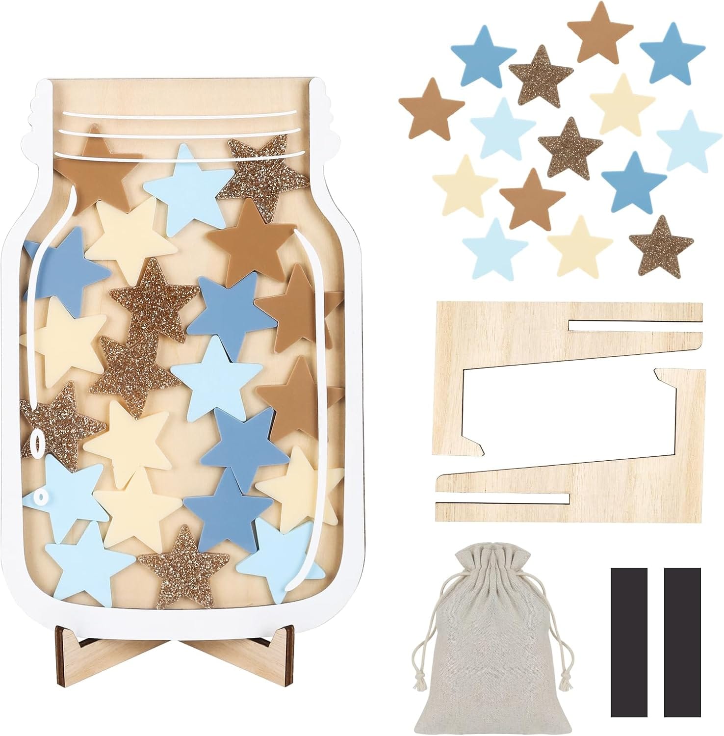 - 1. Complete Star Jar Set Includes 1 wooden star reward jar, 25 sparkling acrylic stars, 1 wooden stand, and 2 magnetic strips. A ready-to-use motivational tool designed to make every achievement shine brightly.