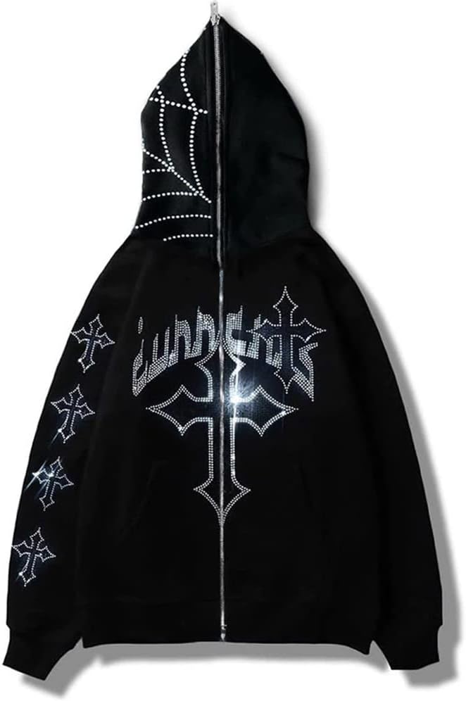 Rhinestone Hoodie Men Women Letter Graphic Gothic Hoodie Print Sweatshirt Full Zip Up Oversized Jacket