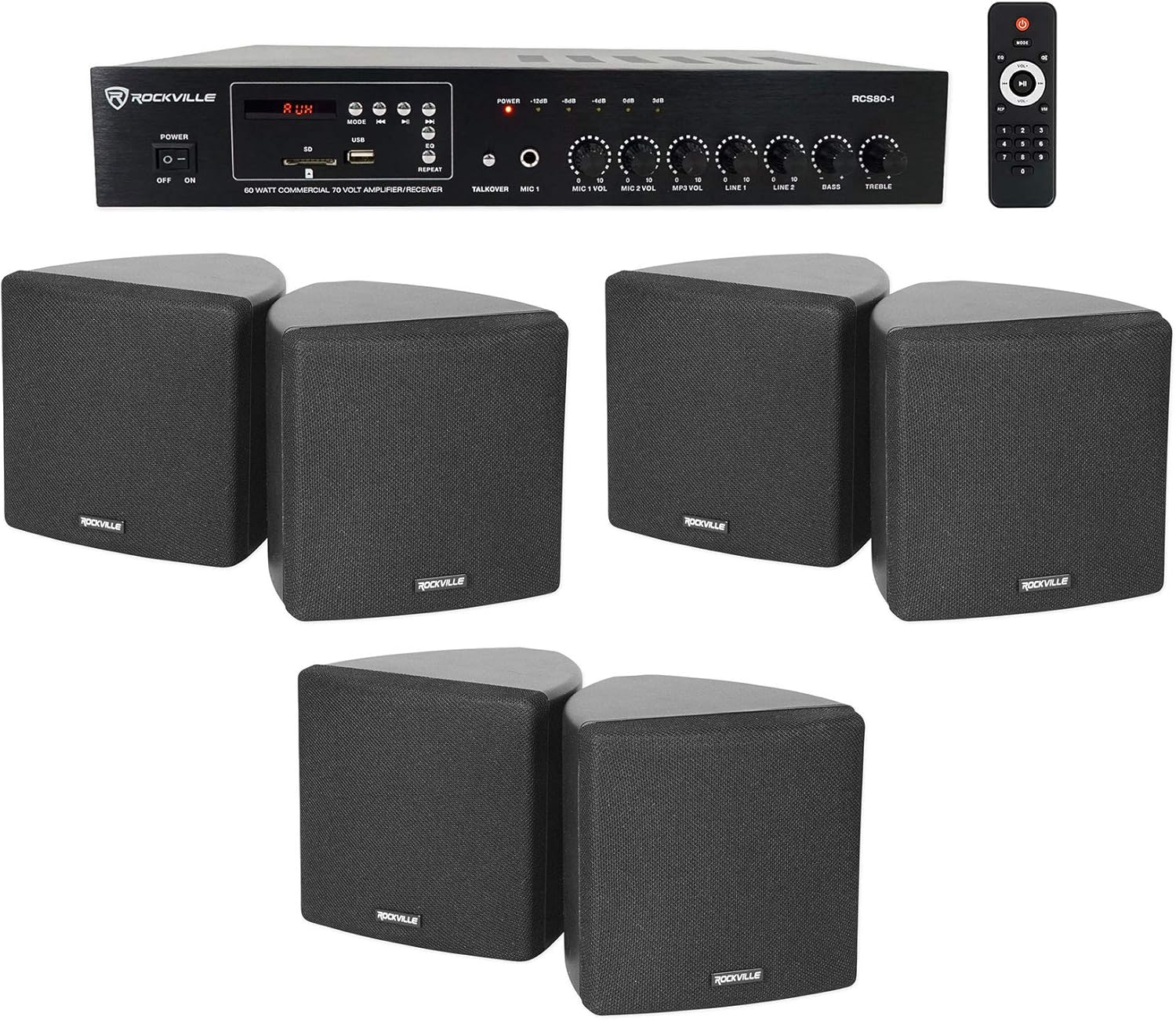 - Package Includes: (1) Rockville RCS80-1 60 Watt 70V Commercial/Restaurant Amplifier/Bluetooth Receiver, (3) Pairs of Cube by Rockville 3.5″ Black Commercial 70V Swivel Wall Mount Speakers (Total 6 Speakers)