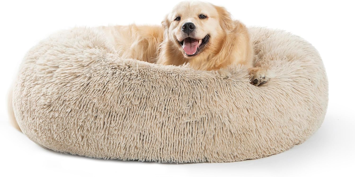SAVFOX Calming Dog Bed, Anti-Anxiety Donut Dog Bed, Plush Faux Fur, Large Size, 36″x36″, 10″ Thick, Durable Construction, Machine Washable