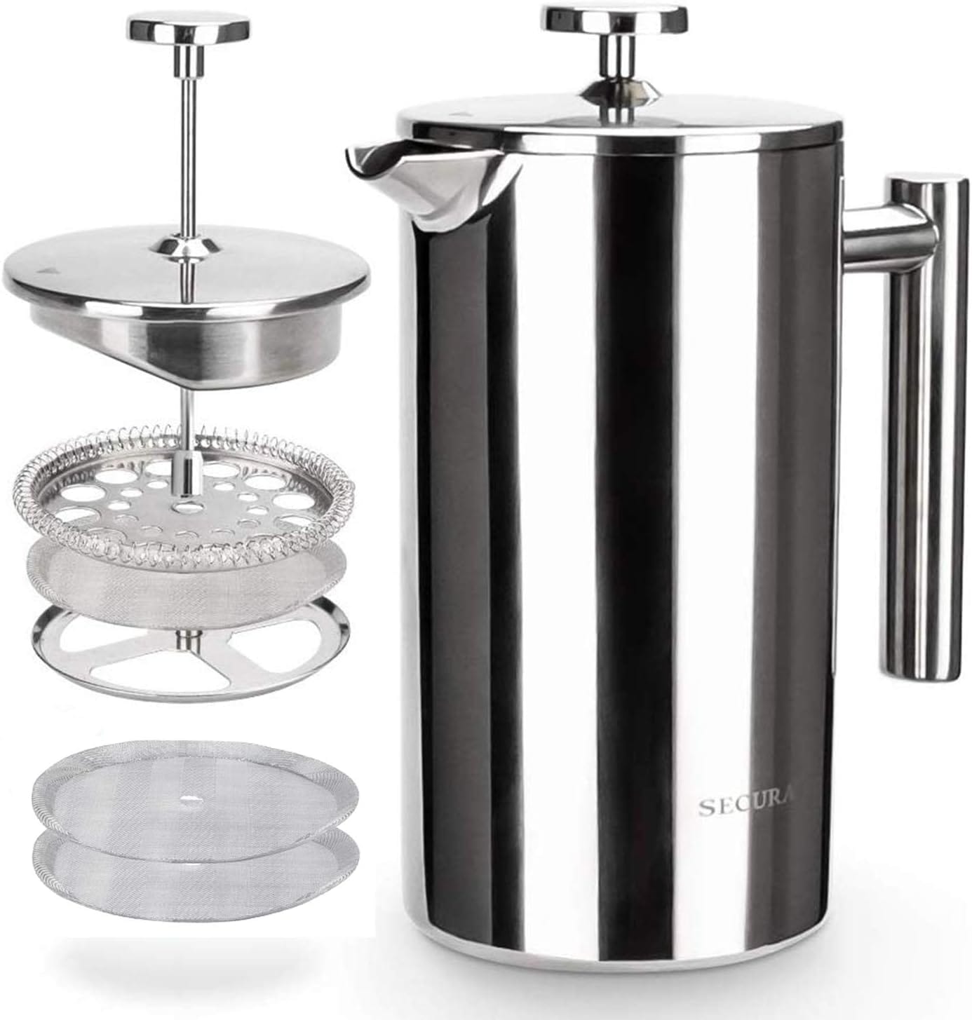 Secura French Press Coffee Maker, 304 Grade Stainless Steel Insulated Coffee Press with 2 Extra Screens, 34oz (1 Litre), Silver