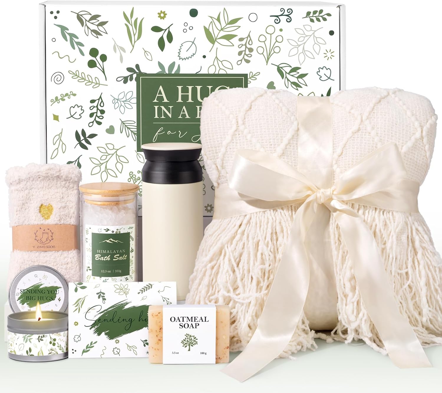 - 8PCS GIFT SET FOR WOMEN: Frerdui self care gifts for women, contains 8 carefully selected items, including a 50X70in knitted tassel blanket, 12oz insulated tumbler, 2.8oz bluebell scented candle, 12.5oz Himalayan bath salt, handmade oatmeal soap, fuzzy socks, decent gift card and gift box. Each self-care gift is well-packaged and presented in a premium gift box to ensure the gift arrives safely.