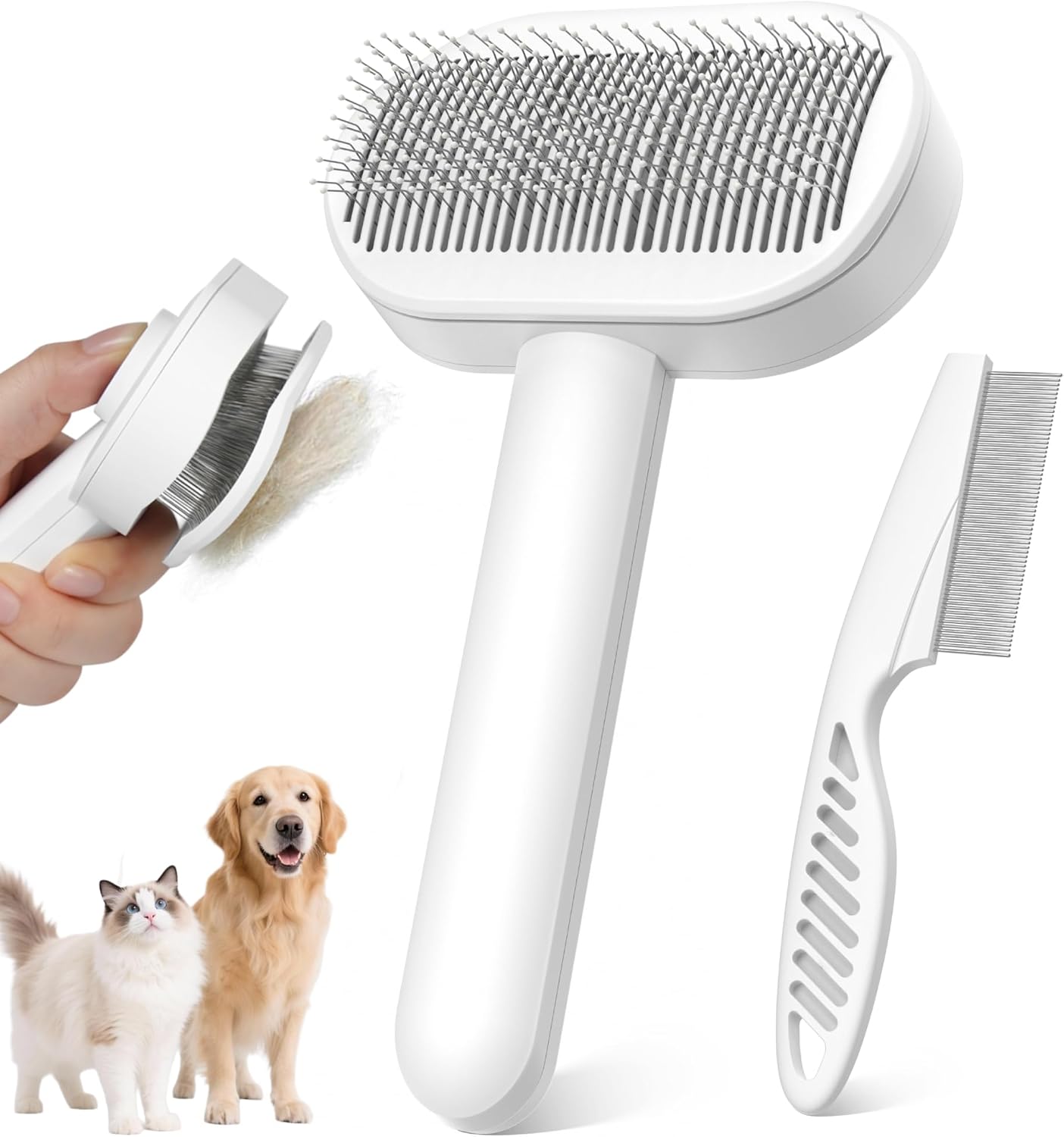 Self-Cleaning Slicker Brush for Dogs & Cats, 3-in-1 Grooming Kit with Detangling Comb & Storage Box, Deshedding Tool for Long Short Hair Pets, Soft Cat Brush Prevents Matting & Tangles, White