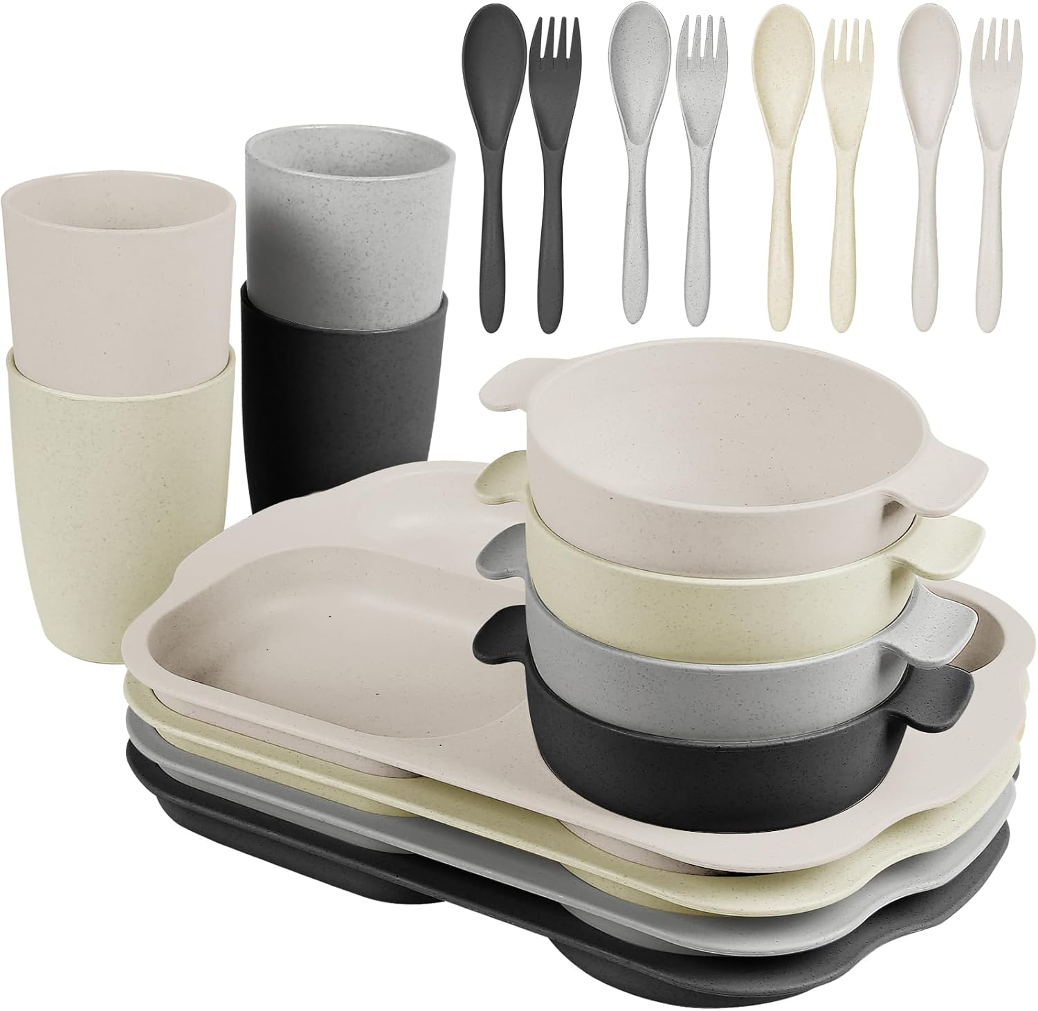 - 【Why Buy Everything Separately?】This unbreakable dinnerware cutlery set includes 20PCS (4 x wheat straw divided plates- 11.8L x8.1W”, 4 x 6.1W” wheat straw kids bowls, 4 x 12oz wheat straw cups- 3″W x 4″H, 4 forks and 4 spoons). Each set comes in 4 beautiful colors. Give you a perfect set of matching designs and colors with its smooth round edges and modern style.