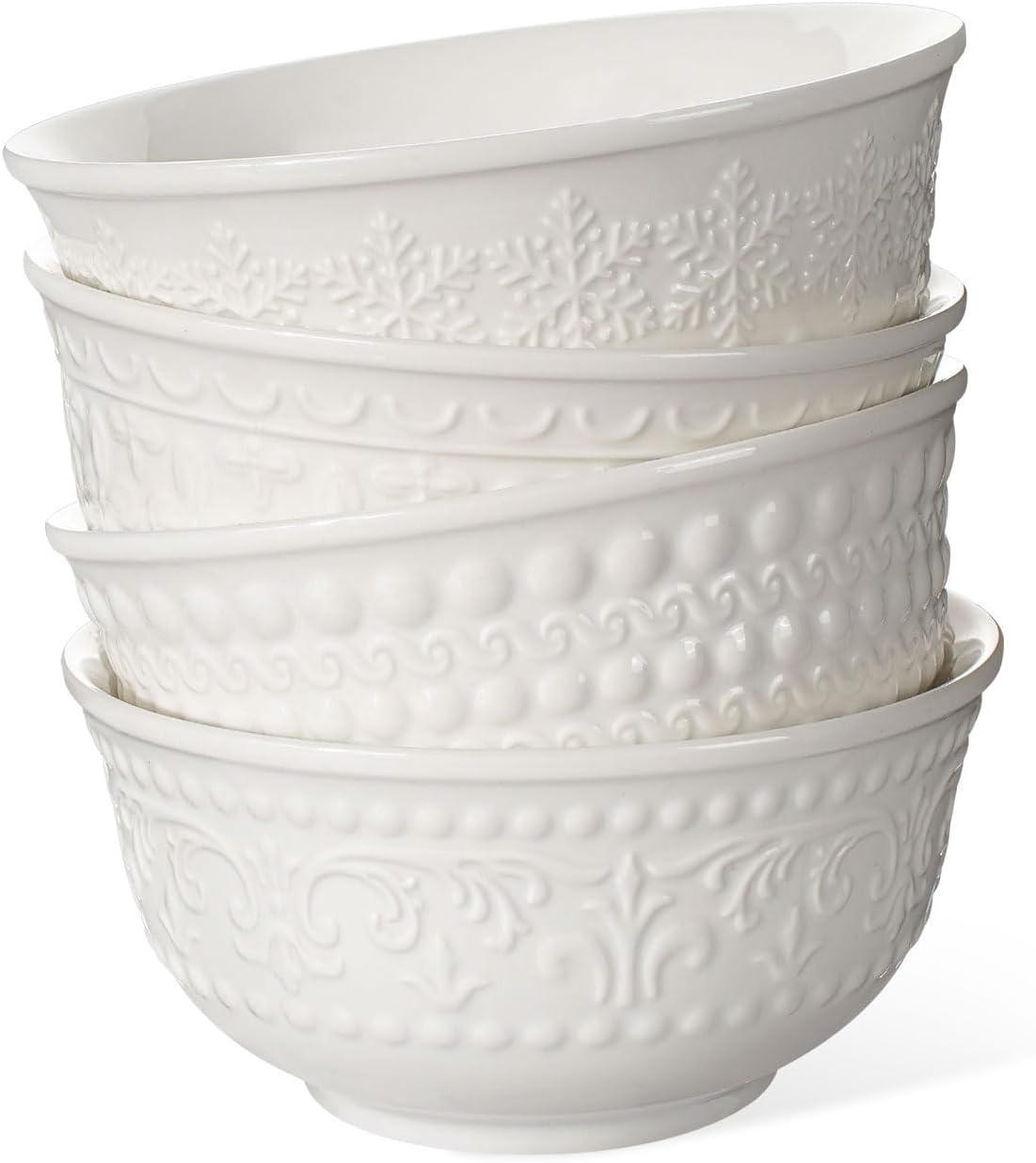 Small Ceramic Bowls – 14 Oz Ice Cream Bowls Set of 4, White Embossment Dessert Bowl for Kitchen, Soup, Side Dishes, Oatmeal, Rice, 4.75 Inch Microwave Oven Safe(Multiple Patterns)