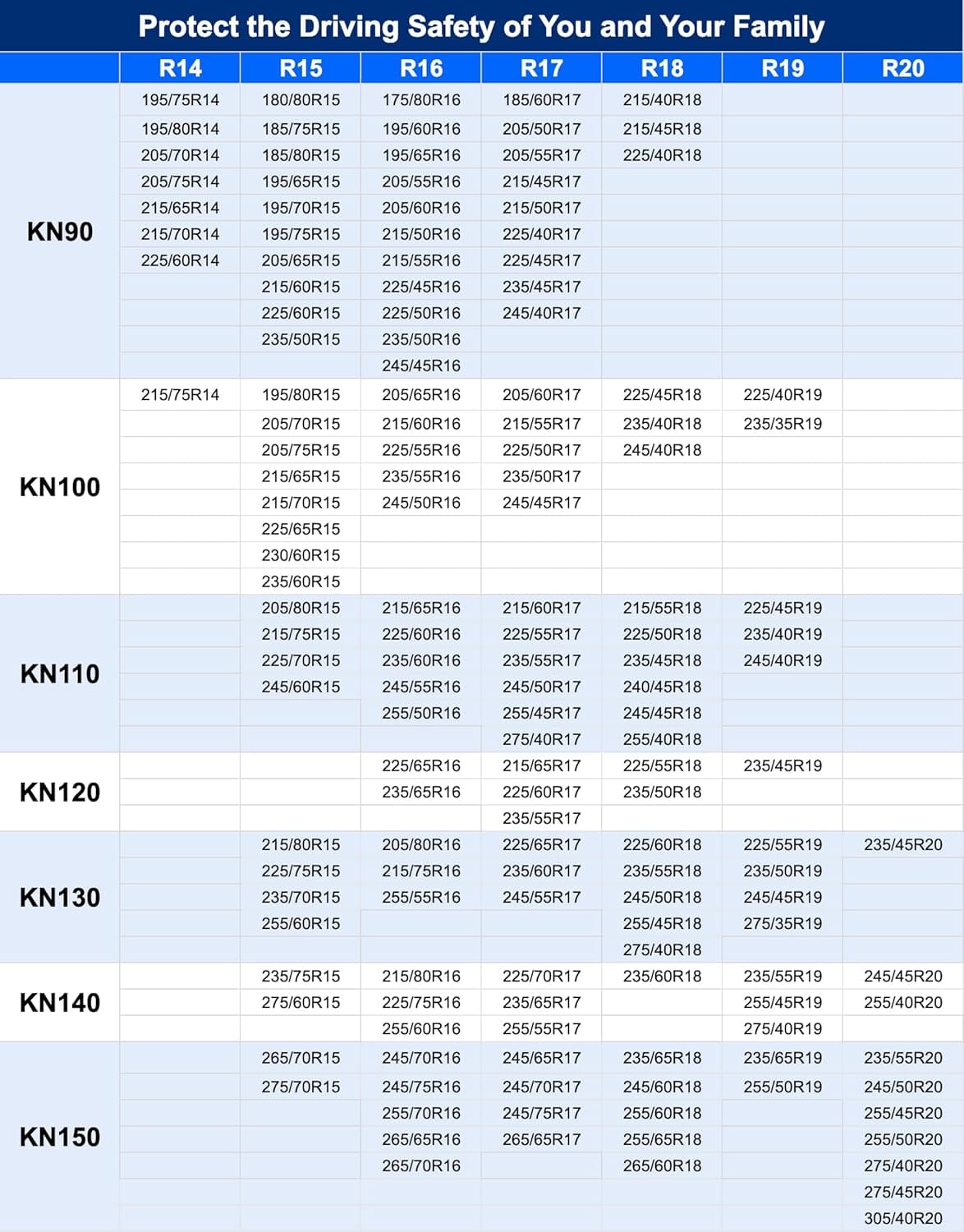 - KN130 anti-skid chains are suitable for the following tire models:205/80R16,215/75R16,215/80R15,225/55R19,225/60R18,225/65R17,225/75R15,235/45R20,235/50R19,235/55R18,235/60R17,235/70R15,245/45R19,245/50R18,245/55R17,255/45R18,255/55R16,255/60R15,275/35R19,275/40R18.If your tires are not included, please let us know.