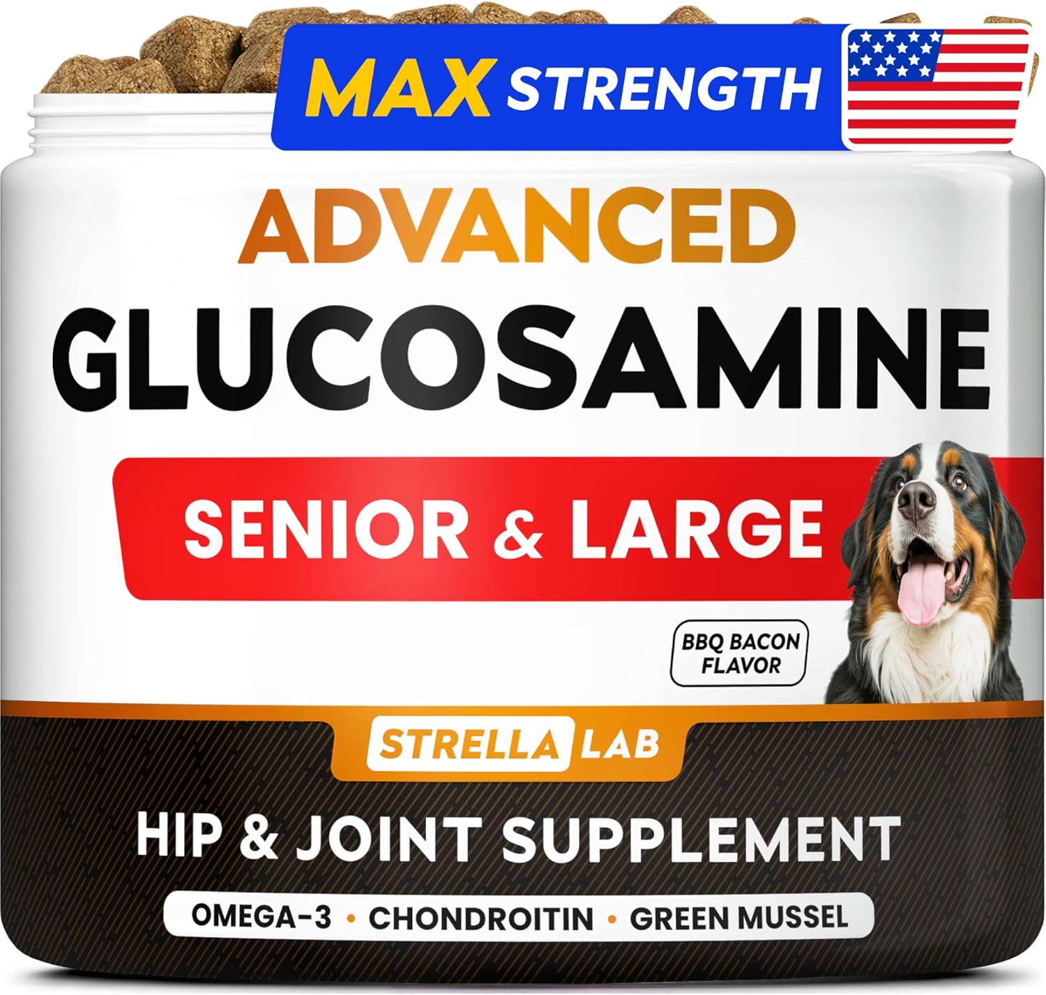 STRELLALAB Advanced Glucosamine Hip & Joint Supplement for Senior Dogs – Green Lipped Mussel & Collagen – Hip & Joint Pain Relief – Large & Small Breed – Joint Health – Bacon – 120 Chews