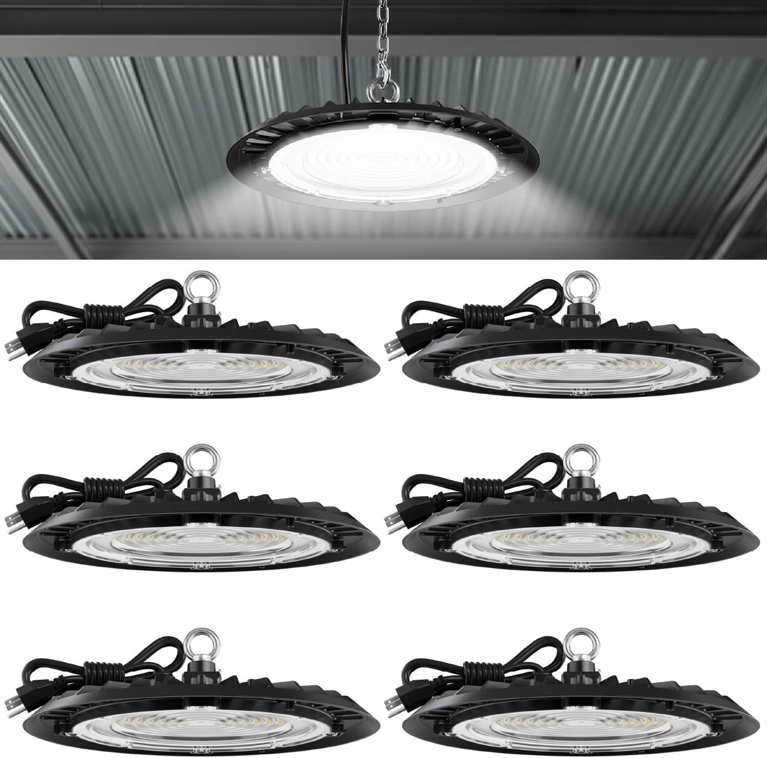 Sunco 6 Pack UFO LED High Bay Light, 150W, 19500 Lumens, 5000k Ultra Bright Commercial Shop Lights for Warehouse, Factory, Workshop, Garage & Barn, Ceiling Mount, Plug & Play, 120V, UL