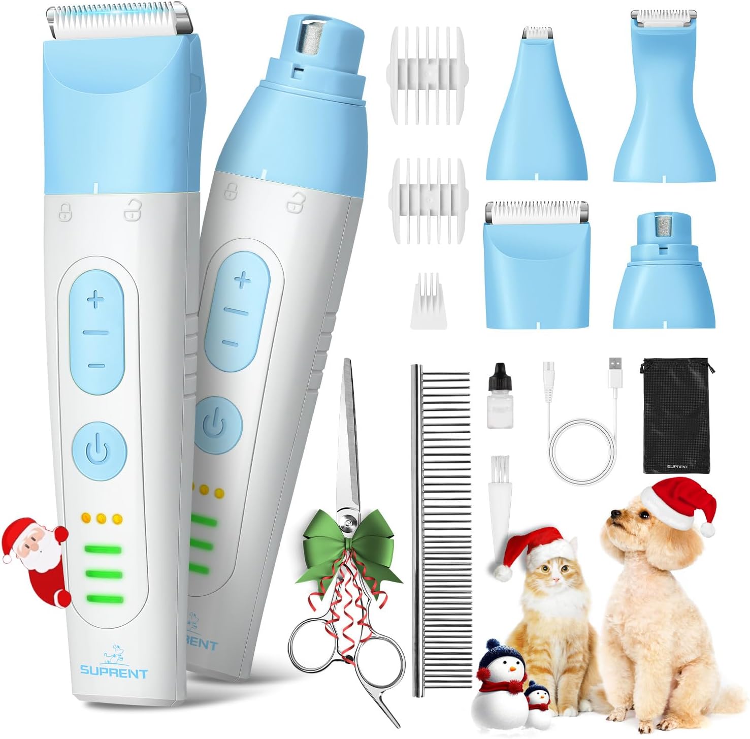 SUPRENT Dog Grooming Kit, 4 in 1 Quiet Pet Clippers for Grooming Supplies, Cordless Cat Paw Trimmer Dog Nail Grinder, Professional Long Hair Shaver Set for Cat Matted Hair and Small Dogs Blue