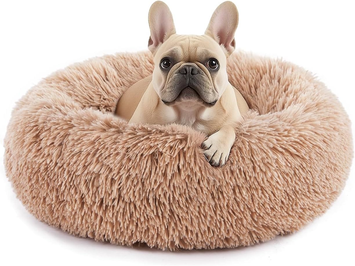 Sweetcrispy Calming Donut Dog & Cat Bed, Machine Washable Cuddle Warming Cozy Fluffy Faux Fur Plush Round Anti-Anxiety Waterproof Anti-Slip Pet Sleeping Sofa for Small Medium animals, Brown, 20 inches