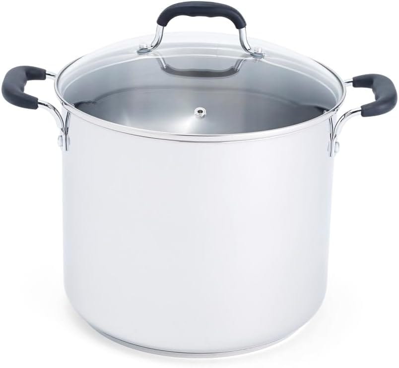 The T-fal Specialty Stainless Steel 12-qt. Stockpot is a stylish and functional addition to any kitchen. This stock pot features a tempered glass lid with a stainless steel finish and air vents that allows the steam to escape. The black silicone handles provide great strength and a firm support. The 3 ply aluminum construction distributes heat evenly to the cooking surface and prevents the formation of hot spots. It is compatible with gas, electric, and glass stove tops. The 12-qt. Stockpot has a capacity of 12 quarts and is dishwasher safe, enabling easy cleaning.