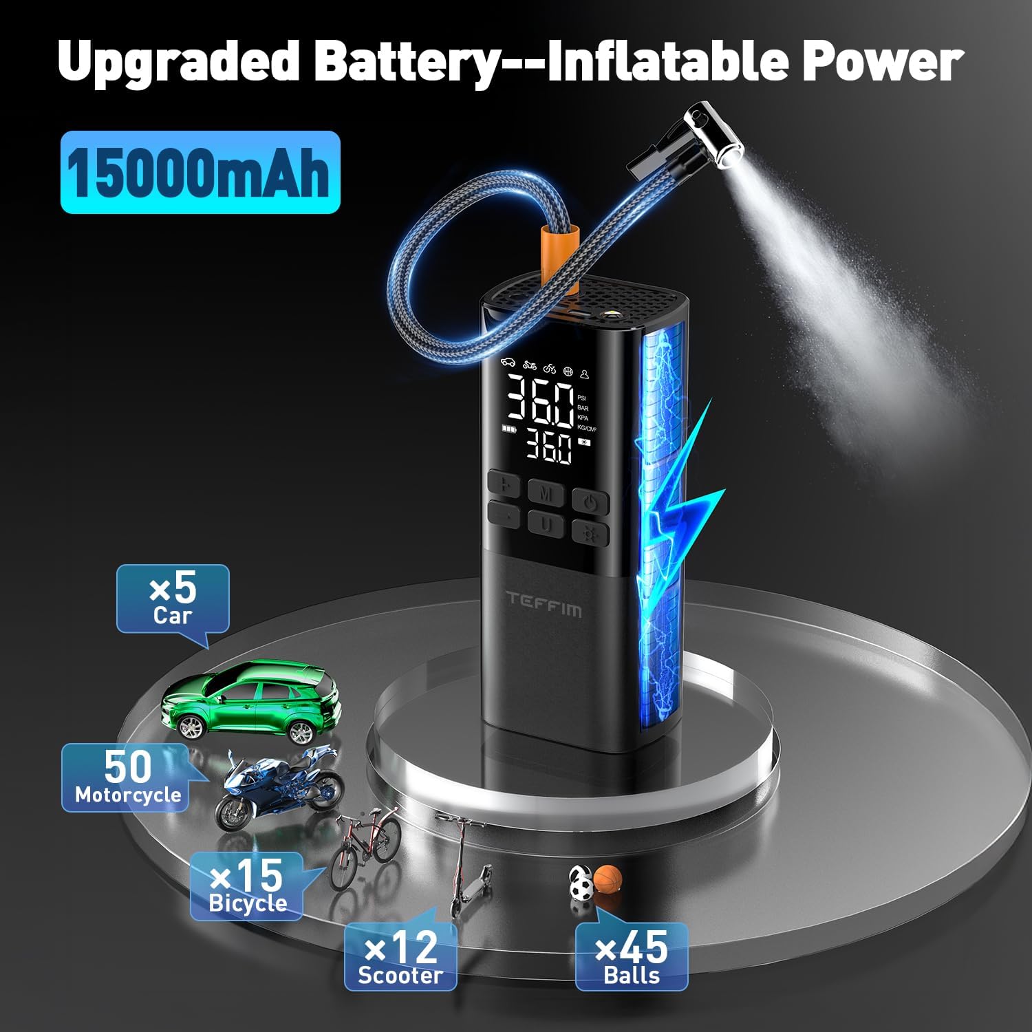 - AMAZING INFLATABLE SPEED: Tire inflator portable air compressor has 6X faster inflation,the tire pump provides 15000mAh battery,150PSI high air pressure can fill 32-36 PIS tires in 45S, up to 35 refills