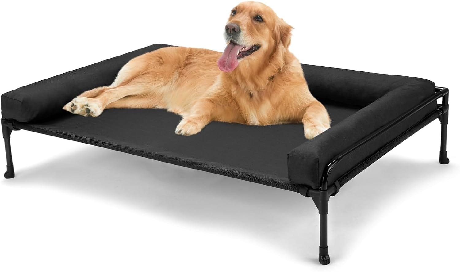 Veehoo Elevated Raised Dog Bed-Cooling Outdoor Dog Cot Bed for Large Sized Dogs Three-Sided Fence Raised Pet Cot with Mesh & No-Slip Feet Dog Hammock Bed with Removable Bolster-41 x 27″ Black