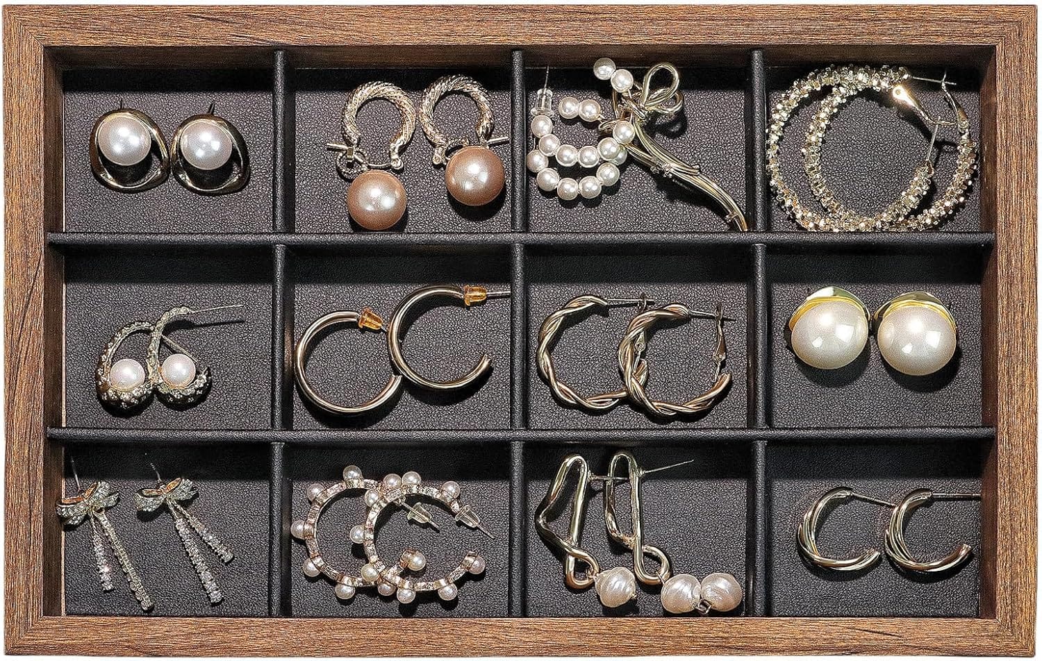 Wood Jewelry Organizer Tray with PU-Leather Linen, Earring Organizer Jewelry Organizer Showcase Display Drawer Organizer Storage, Earring Holder Necklace Bracelet Ring Accessary Organizers (12 Grids)
