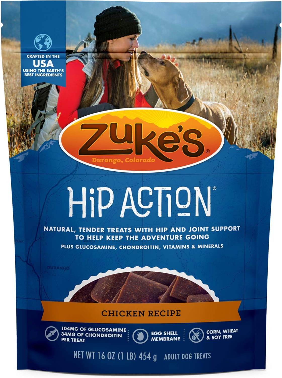 Help keep the adventure going by supporting your dogs hip and joint health and mobility with Zukes Hip Action Chicken Dog Treats. Crafted in the USA using protein-rich chicken as the number 1 ingredient, these natural dog treats keep the good times going strong. Every tasty Zuke’s Hip Action dog treat contains leading levels of chondroitin and glucosamine for dogs to support your dog’s mobility. Antioxidant-rich whole food berries, plus vitamins and minerals for dogs, make these treats nutritious and delicious. Egg shell membrane in each soft and chewy dog treat helps support hip and joint health. Hip Action dog treats contain no corn, wheat or soy and are trail-tested to ensure they meet our high standards of quality. A resealable pouch makes Zukes Hip Action treats convenient to take along on every journey, whether thats a morning walk or a weekend hike. Live life off leash your way, and keep the adventure going with Zuke’s Hip Action Hip and Joint Dog Treats.
